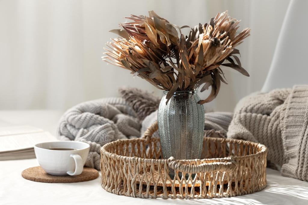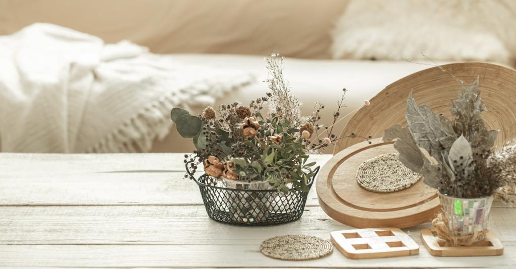 Recyclingglas, Altholz oder OSB-Platten bringen Struktur und Geschichte mit. Kanten sauber versiegeln, Splitter entfernen und Schutz verwenden – dann sind sie alltagstauglich. So entsteht ein Look, der bewusst, robust und zeitlos wirkt, ohne dein Budget zu sprengen oder Ressourcen zu verschwenden.